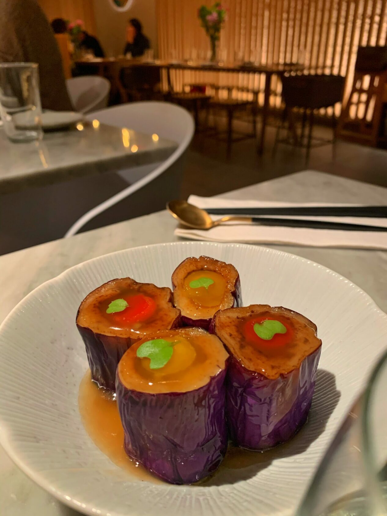 Sogar Vegetarier und Pescetarier dürfen sich über geniale Kreationen freuen. So lassen beispielsweise optische Kunstwerke wie gegrillte Auberginen mit fermentiertem Ei oder der in einer Suppe gegarte Fisch die lechzenden Raubtierzungen Purzelbäume schlagen.